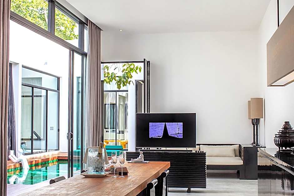 This pool villa offers a walk-in closet, a living area and a dining area equipped with pantry and a refrigerator. Guests can also relax at a saltwater swimming pool. For added convenience, there are 55-inch smart TVs with Blu-ray players, sound bar, mood lighting and outdoor speakers. An private bathroom includes a spa tub, a rain shower as well as male and female sinks. There are also a safety box, a coffee maker, wine fridge and a mini-bar.
